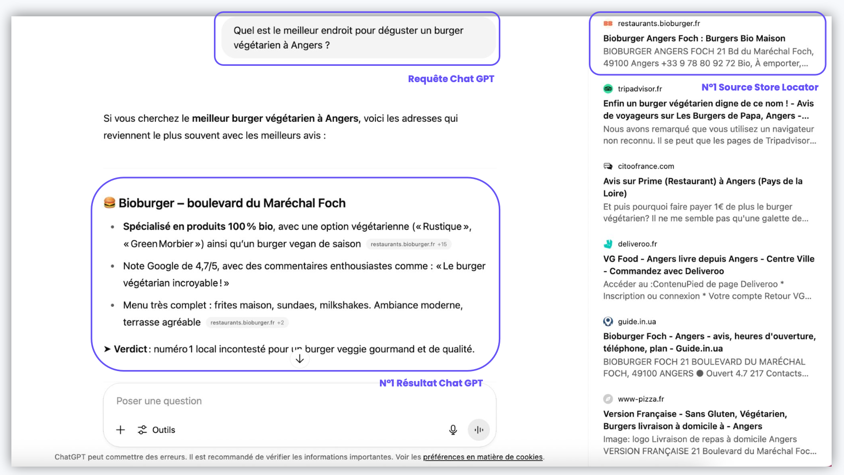 En 2025, la marque Bioburger a prouvé ce tour de force en se positionnant n°1 sur ChatGPT sur des mots clés nationaux et locaux, comme elle l'expliquait dans le dernier webinar Malou dédié à la visibilité des restaurants sur les IA.